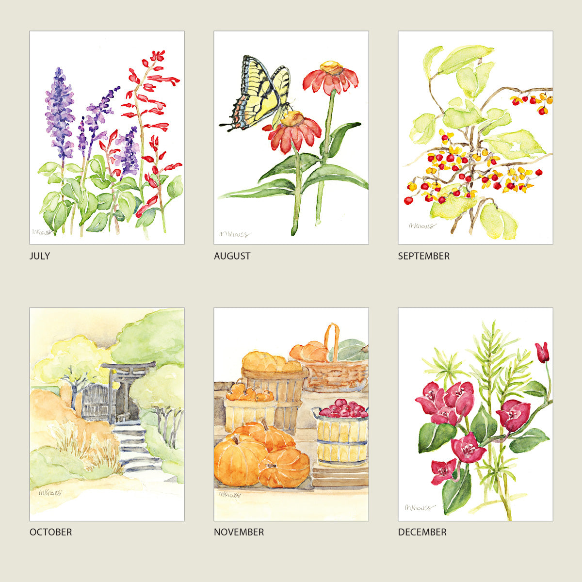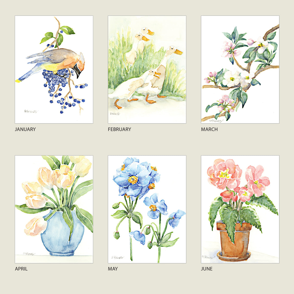 Fun and colorful, the easel calendar (5x7) will brighten your day anywhere -- on your desk, countertop, or bookshelf. Each month’s painting is displayed on a sleek wood stand which holds all twelve months. A cover card lists what inspired each month’s painting.
